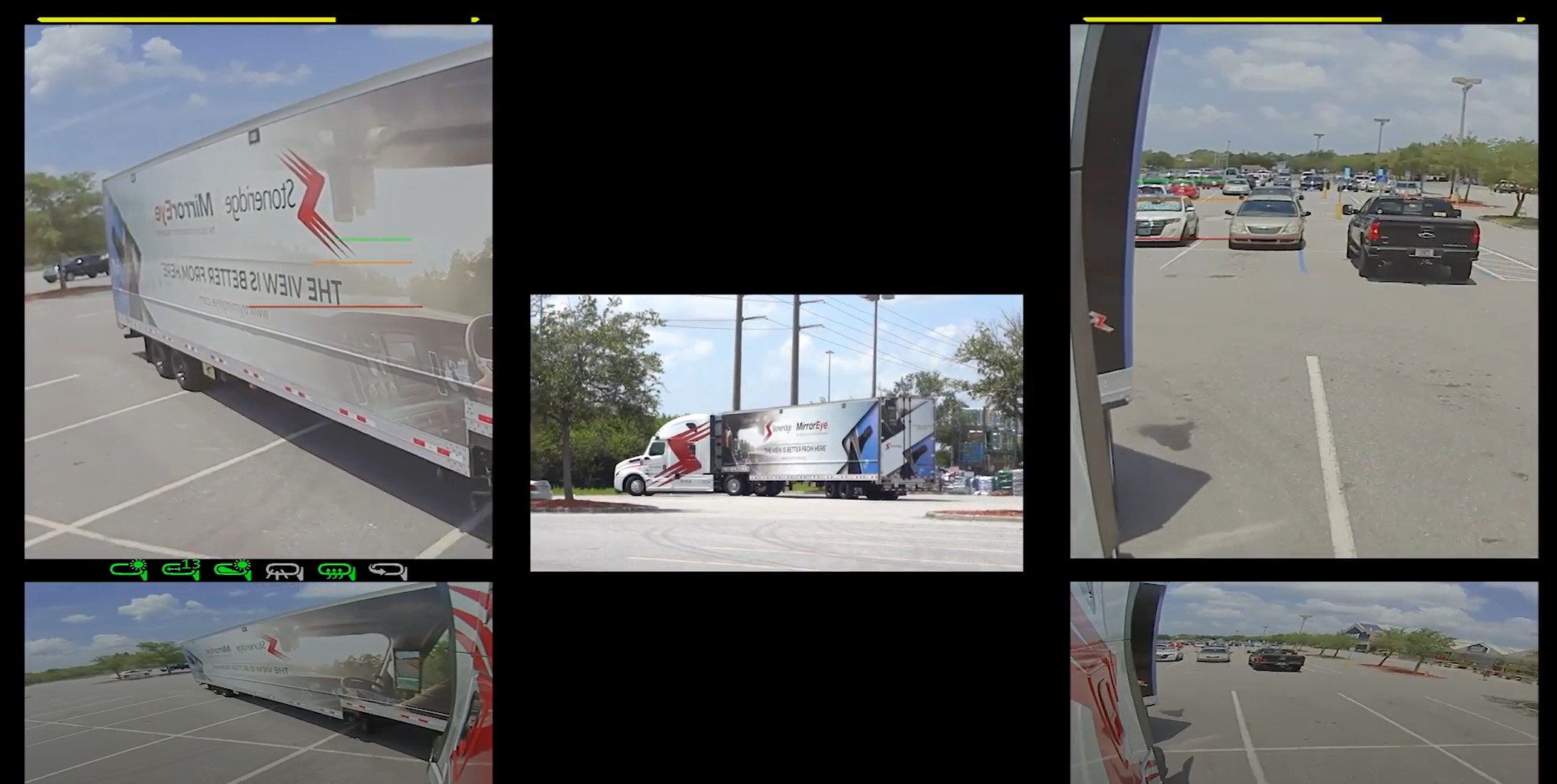 An enhanced field of view when compared to the required rear-vision mirrors. Also, it eliminates blind spots on both sides of the truck and expands the field of view by an estimated 25 percent. Additionally, the trailer panning feature automatically tracks the end of the trailer to keep it in view when the truck is moving forward, potentially eliminating right-hand turn collisions. The system uses high definition cameras and monitors that include features such as color night vision, low light sensitivity and light and glare reduction. MirrorEye has self-cleaning lenses to eliminate problems with rain and dirt, along with a defrosting system for winter driving. MirrorEye is a fail-safe operating system in the event of an individual camera failure, there are 3 cameras per side, others will remain operational. The MirrorEye monitors are mounted inside the cab on the A-pillars and provide drivers with three views – a wide angle, narrow angle and passenger-side “look-down” camera.